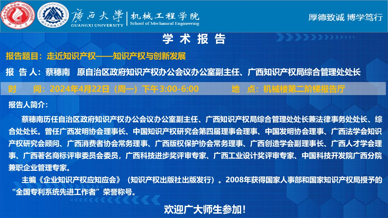 【機(jī)械工程學(xué)院學(xué)術(shù)報(bào)告】走近知識(shí)產(chǎn)權(quán)─知識(shí)產(chǎn)權(quán)與創(chuàng)新發(fā)展報(bào)