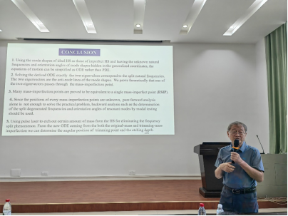 張建成教授分享了其團隊在過去數(shù)年的科研成果,其主頻譜分析、力元理論等原創(chuàng)性方法已成功應用于相關的工程和醫(yī)學領域。一個個鮮明的應用案例,讓師生們感受到力學與數(shù)學的關聯(lián)與魅力。張家歐教授闡述了半球諧振陀螺儀在航空航天領域的應用,分享了其課題組近年來對“石英諧振半球殼進行頻差修正以提升半球諧振陀螺儀性能和精度”的研究成果。