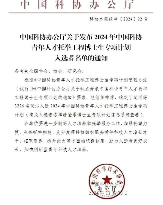 據(jù)悉,中國科協(xié)青年人才托舉工程博士生專項計劃于2024年首次試點設(shè)立,旨在讓學(xué)術(shù)資源更廣泛地惠及有發(fā)展?jié)摿Φ那嗄昕萍己髠滠姡?0周歲以下高年級在讀博士研究生為支持對象,依托全國學(xué)會、協(xié)會、研究會進行托舉培養(yǎng),為入選者提供組織吸納、學(xué)術(shù)兼職和學(xué)術(shù)資助等托舉服務(wù),助力優(yōu)秀博士研究生更好成長,加快創(chuàng)新型青年科技人才培養(yǎng),充分發(fā)揮科協(xié)組織服務(wù)青年科技人才增長才干、拓寬眼界、提升能力等方面的積極作用,通過組織吸納、安排學(xué)術(shù)兼職、支持學(xué)術(shù)論文發(fā)表、提供學(xué)術(shù)交流平臺、資助開展出國(境)訪學(xué)等方式,助力優(yōu)秀博士研究生更好成長。