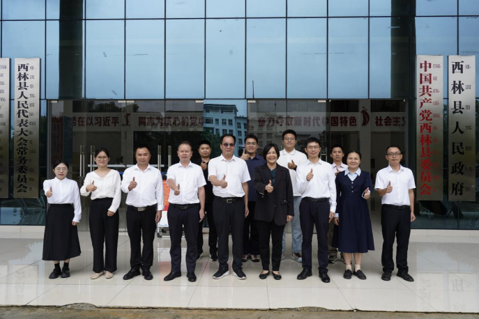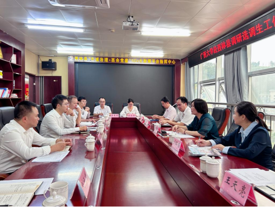 為貫徹學(xué)校黨委關(guān)于選調(diào)生工作的決策部署,落實“扶上馬,送一程,關(guān)懷一輩子”的指示精神,深化鄉(xiāng)村振興與民族團結(jié)工作,9月30日,學(xué)院黨委聯(lián)合校學(xué)工部、校友辦赴百色市西林縣開展選調(diào)生走訪調(diào)研工作。學(xué)院黨委書記盧嬋江、副書記黃路明、副院長陳宏波、校友辦副主任黃庶冰、學(xué)工部代表王天亮以及我院輔導(dǎo)員等一行7人一同前往走訪慰問。西林縣委常委、組織部部長、黨校校長諶宏明,縣委組織部副部長、公務(wù)員局局長李富銀,以及在西林縣服務(wù)的廣西大學(xué)選調(diào)生代表等9人參加座談交流。