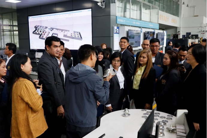 為進(jìn)一步深化廣西與泰國教育交流與合作,推動構(gòu)建更為緊密的中國—東盟命運(yùn)共同體,10月23日,由自治區(qū)教育廳舉辦的“人工智能在教育領(lǐng)域的應(yīng)用”中泰教育交流會在我校舉行,泰國暖武里府行政機(jī)構(gòu)主席通猜·贏布拉瑟上校(Pol.Col.Thongchai Yenprasent)帶領(lǐng)由泰國32所大、中、小學(xué)校的校長組成的泰國暖武里府政府及朱拉隆功大學(xué)代表團(tuán)的44位成員到我院參觀中國—東盟智能制造技術(shù)創(chuàng)新學(xué)院。泰國暖武里府行政組織副主席Miss Issaya Sathornsantikul(依薩雅.薩通散迪昆)、泰國暖武里府教育廳廳長?Miss Nataraporn Pichayagorn(娜塔拉蓬·皮查亞功)、自治區(qū)教育廳對外合作與交流處一級調(diào)研員呂青、廣西教師培訓(xùn)中心(廣西外語培訓(xùn)中心)對外交流與合作部部長唐燕艷等自治區(qū)教育廳、南寧市教育局、廣西高校及南寧市中小學(xué)代表等教育界代表一同參觀。廣西大學(xué)副校長肖建莊、國際合作與交流處處長廖文丹及副處長郭宇路、龔衛(wèi)華全程陪同。學(xué)院黨委書記盧嬋江、黨委副書記黃路明、副院長李俚、黃豪中、莫帥、陳宏波等院領(lǐng)導(dǎo)全程接待。