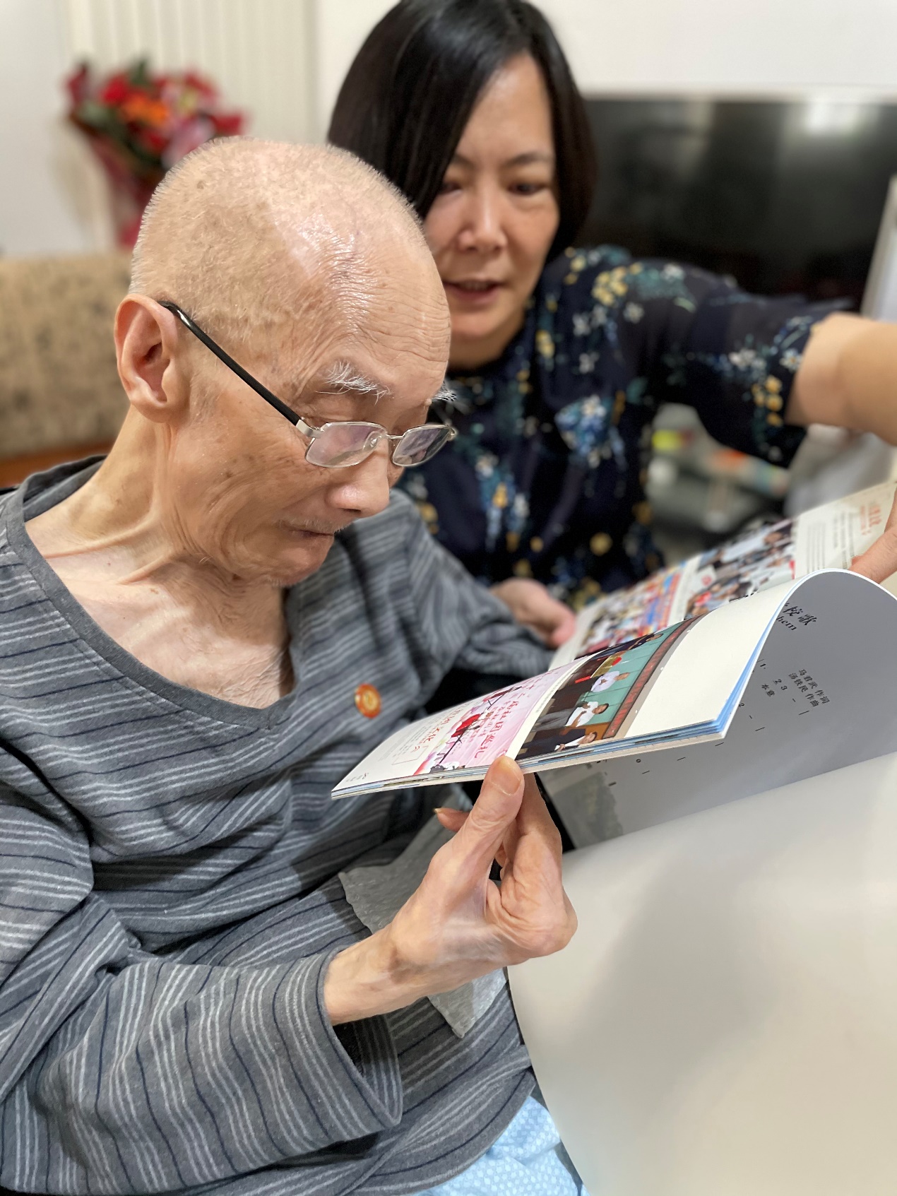 當(dāng)日適逢魏乃文校友100歲壽辰,盧嬋江一行為魏老先生送上精心準(zhǔn)備的文創(chuàng)禮品和鮮花等以表祝賀。學(xué)院還特別為魏老制作了“杰出校友”獎杯,同時帶去廣西大學(xué)?;蘸彤媰裕蛭豪辖榻B學(xué)校、學(xué)院近年來的發(fā)展成績。魏老雖年事已高,但在翻看畫冊時仍反復(fù)強(qiáng)調(diào)自己是1943年入學(xué)廣西大學(xué)、1948年畢業(yè),還說記得當(dāng)時的校長是陳劍脩先生,西大學(xué)子悠悠情深可見一斑。