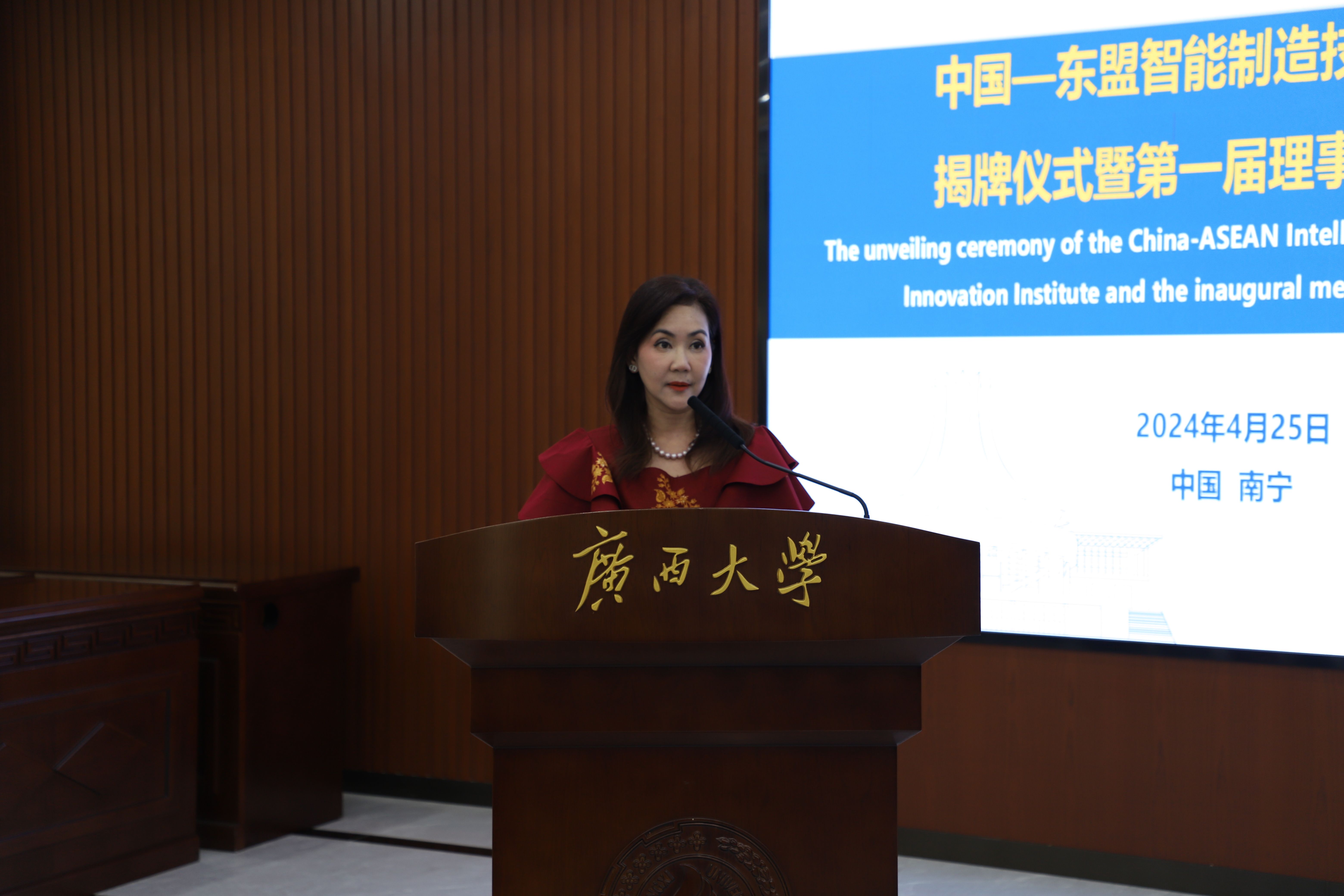 揭牌儀式上,馬獻(xiàn)力代表學(xué)校對中國-東盟智能制造技術(shù)創(chuàng)新學(xué)院的成立表示祝賀。他強(qiáng)調(diào),學(xué)校歷來重視與東盟國家高校的合作與交流,聚焦“亞熱帶、東盟、海洋、邊疆民族”辦學(xué)特色,與東盟國家深入開展多項(xiàng)中外聯(lián)合辦學(xué)及科研合作,學(xué)科國際影響力不斷提升。今年,廣西政府聚焦打造中國職業(yè)教育創(chuàng)新高地、服務(wù)中國-東盟共同發(fā)展,批準(zhǔn)建設(shè)首批10所與區(qū)域特色優(yōu)勢產(chǎn)業(yè)深度融合的高起點(diǎn)、高標(biāo)準(zhǔn)、高水平的技術(shù)創(chuàng)新學(xué)院,重點(diǎn)培養(yǎng)支撐產(chǎn)業(yè)技術(shù)創(chuàng)新的高層次技術(shù)人才,解決產(chǎn)業(yè)發(fā)展的關(guān)鍵技術(shù)問題,推動重大科技成果產(chǎn)業(yè)化。由我校機(jī)械工程學(xué)院牽頭建設(shè)的“中國-東盟智能制造技術(shù)創(chuàng)新學(xué)院”就是其中之一。中國-東盟智能制造技術(shù)創(chuàng)新學(xué)院的成立和建設(shè),是我校積極落實(shí)“深耕東盟,著眼世界”的國際化發(fā)展戰(zhàn)略的一項(xiàng)重要舉措,也將為自治區(qū)建成立足廣西、面向東盟、服務(wù)共建“一帶一路”的職業(yè)教育對外開放合作創(chuàng)新高地貢獻(xiàn)重要力量。